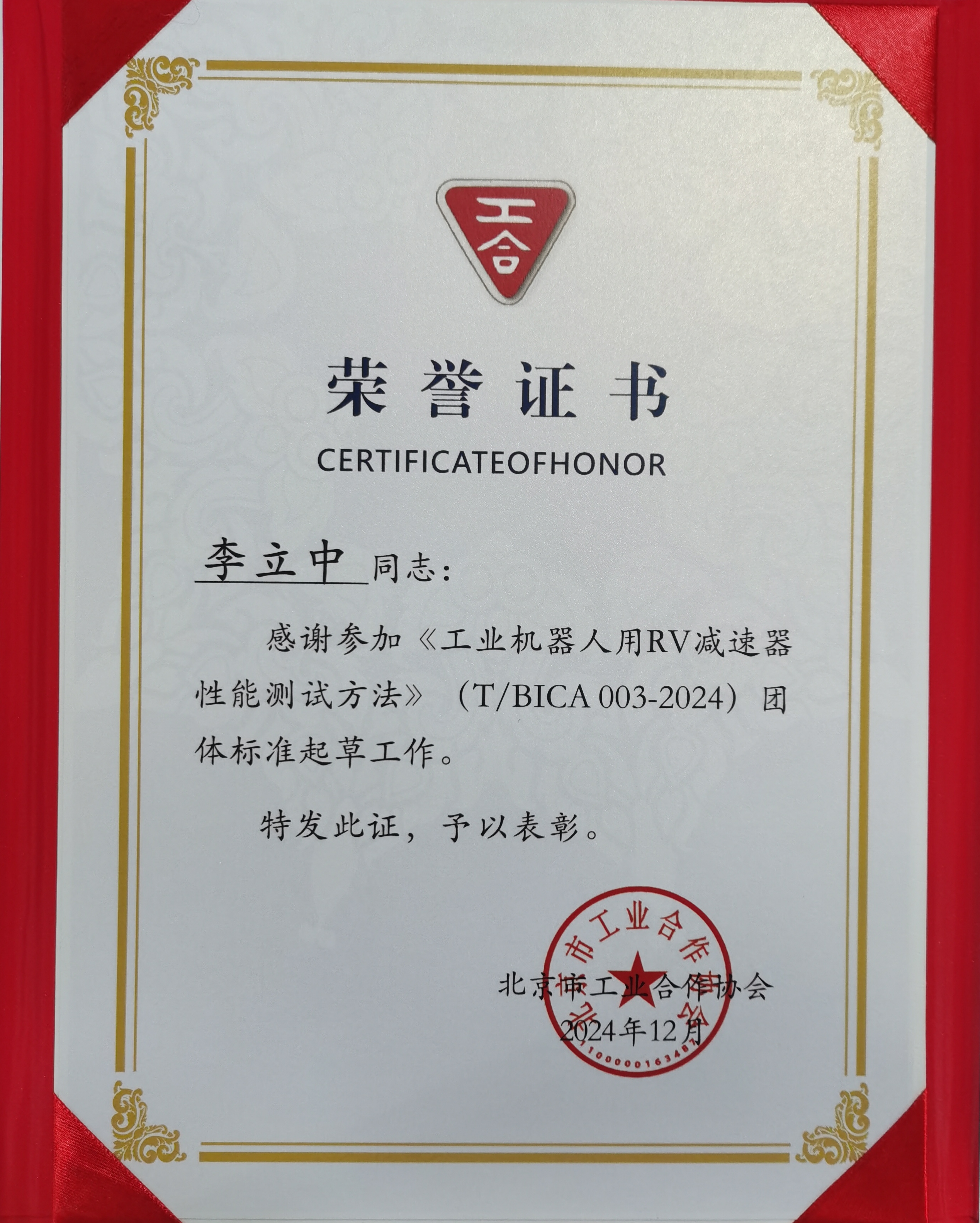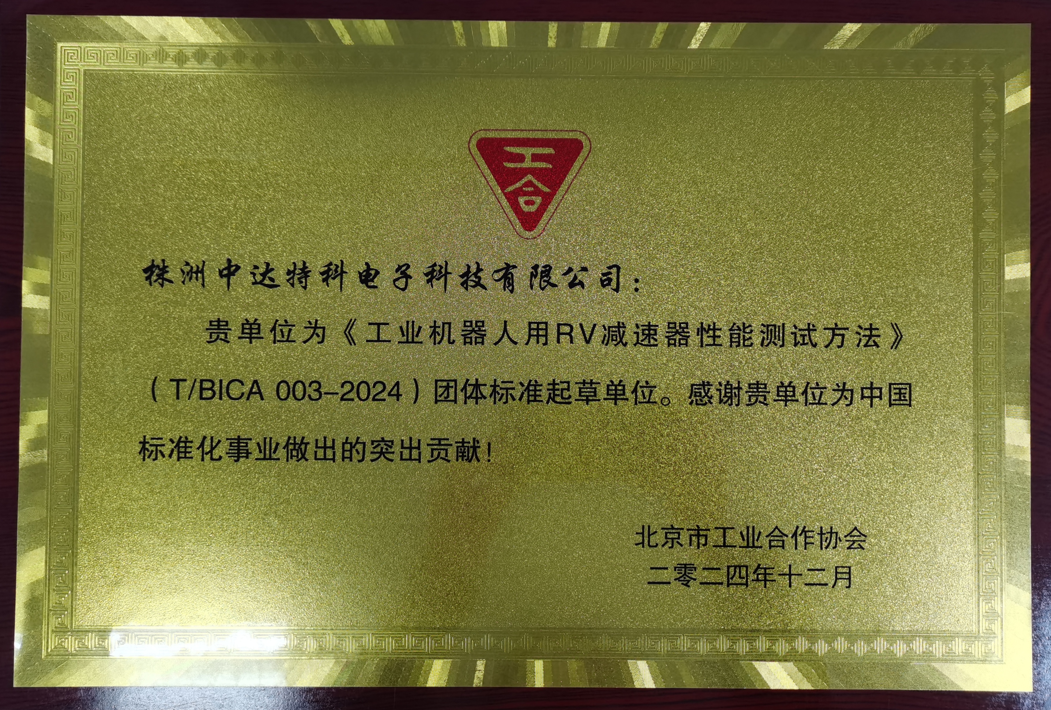 為表彰我公司在標(biāo)準(zhǔn)制定中的突出貢獻(xiàn),相關(guān)行業(yè)協(xié)會(huì)特別頒發(fā)了榮譽(yù)牌匾和證書。牌匾上鐫刻著“《工業(yè)機(jī)器人用RV減速器性能測(cè)試方法》團(tuán)體標(biāo)準(zhǔn)起草單位”的金色字樣,熠熠生輝;榮譽(yù)證書則詳細(xì)記錄了我公司在標(biāo)準(zhǔn)制定中的具體貢獻(xiàn),成為公司技術(shù)實(shí)力的又一有力證明。